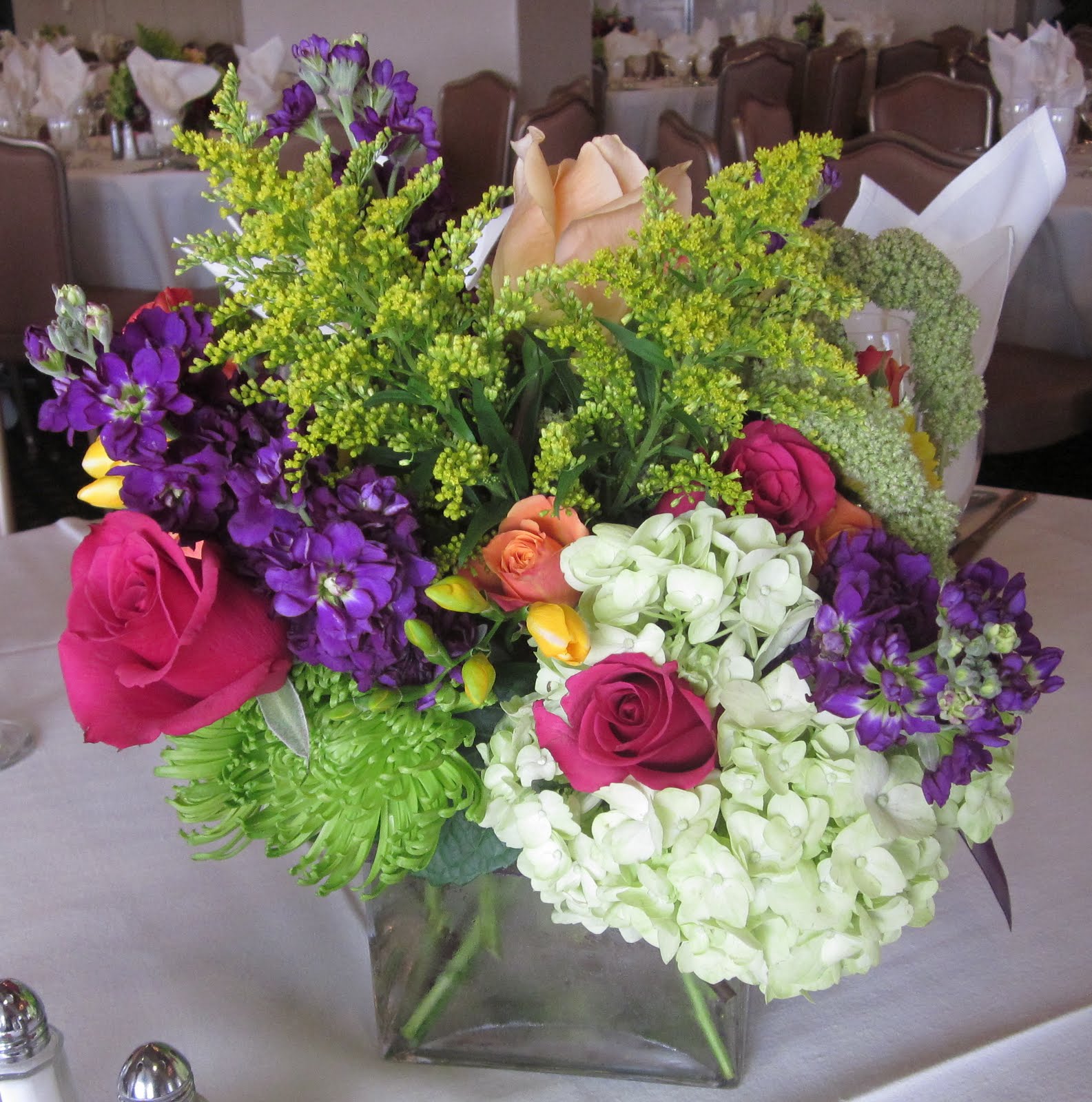 One of their centerpieces featured floating purple makara orchids with fuchsia and lavender rose petals. All centerpieces sat on top of our new apple and plum linen table toppers.